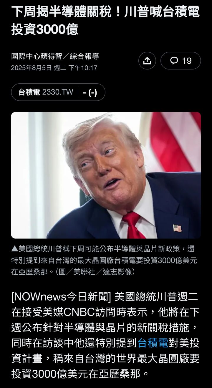 拒當韭菜俠 追蹤 專欄作家 Lv.101 08月06日 08:54 大盤漲250點,發生什麼事? 加權指數 台積電 鴻海 佳能 聯發科 展開 +6 半導體關稅即將震撼登場😱😱😱 繼續閱讀 55 1P 10則留言 打賞 分享 留言 讚