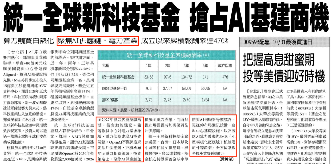 當全球投資人都在追逐 AI 晶片巨頭時,真正決定 AI 命脈的,其實是「電力」。知名理財部落客「股海老牛」在 YouTube 節目中指出,祖克柏、黃仁勳、馬斯克等科技巨頭都已警示「缺電」是 AI 發展的最大挑戰。老牛比喻,AI 是淘金樂,晶片是金子,而電力就是賣鏟子的人,真正穩賺的是電力基礎設施。他特別開箱一檔超關鍵的 ETF 星光美國電力基建(009805......