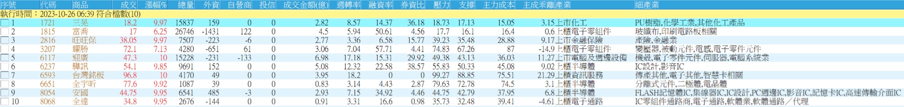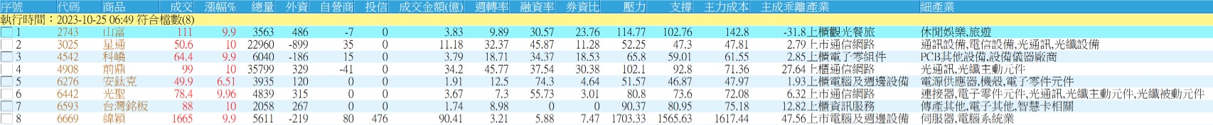 瓦吳❤️當沖 追蹤 熱心同學 Lv.16 2023年10月26日 07:33 三晃 迎廣 安國 耀勝 台灣銘板 展開 +5 10/26 XQ程式選股 --- 隔日沖 繼續閱讀 13 2P 3則留言 打賞 分享 留言 讚